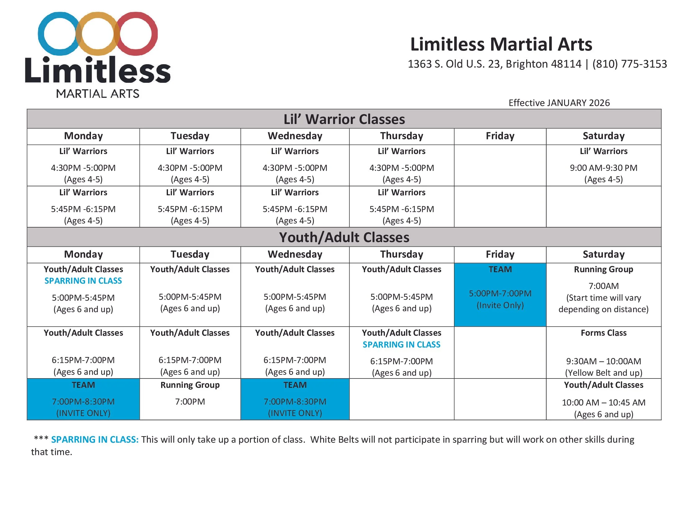 The schedule for the classes and programs that Limitless Tkd (Taekwondo) offers. Important events, like tournaments and seminars, are at the bottom of the page.